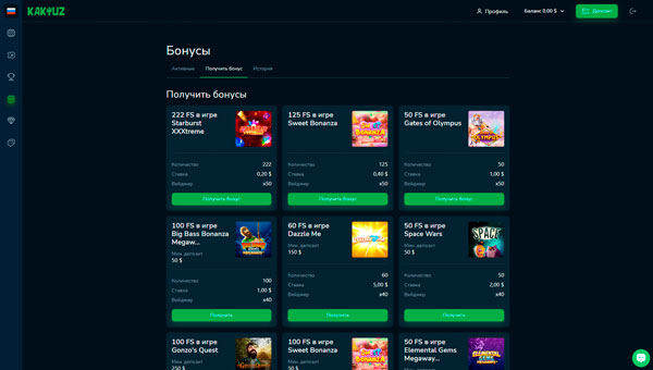 У казино неожиданно широкая для европейского проекта бонусная программа. Даже бездепозитные подарки, уже отмененные на большинстве гемблинг-сайтов, у Kaktuz есть. Особенно приятно, что вид подарка игроки на старте могут выбрать: