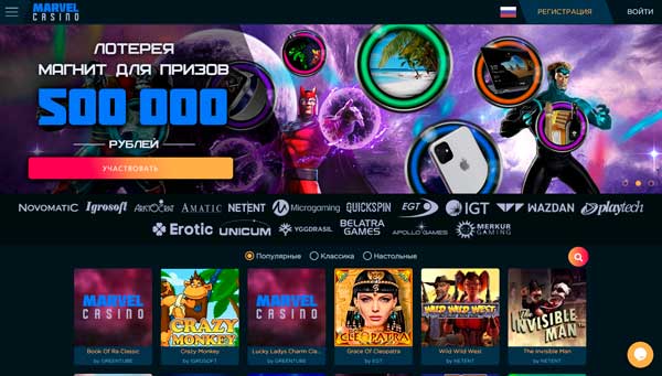 - Популярные игры — в данном разделе меню собраны все те игры, которые пользуются большой популярностью среди клиентов Marvel Casino.